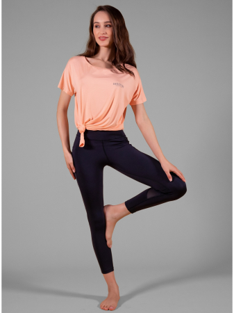 Костюм для спорта от торговой марки Индефини. В комплекте футболка с леггинсами. Футболка из бамбука, лососевого цвета, с принтом, с короткими рукавами, укороченная, с декоративной сборкой спереди, свободного кроя. Леггинсы черного цвета, со вставками из микросетки, средней посадки.