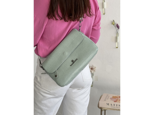 Два ремня, короткий и длинный с возможностью регулировки. Внутри: два больших отделения с перегородкой в виде кармана на молнии, два кармана для аксессуаров, одно из которых на молнии. Снаружи: спереди карман на молнии. Сзади отделение для мелочей на молнии.