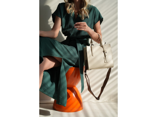 Две короткие ручки. Текстильный ремень на плечо + длинный кожаный ремень с возможностью регулировки. Три основаных отделения. Одно застегивается на молнию + внутри карман для телефона, дополнительный карман для аксессуаров на молнии. Два других отделения застегиваются на магнитную клепку.