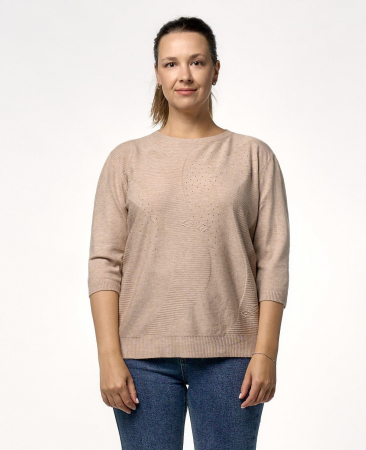 Джемпер женский прямой полуприлегающий крой с круглым вырезом и рукавом 3/4, декорированный небольшими блестящими стразами. Выполнен из трикотажной ткани, материал мягкий и приятный на ощупь, в меру эластичный - хорошо сидит по фигуре. Низ изделия, ворот и манжеты рукавов выполнены эластичным материалом в рубчик. Подобные модели отличаются такими качествами как удобство и комфорт, практичны и удобны в повседневной носке.