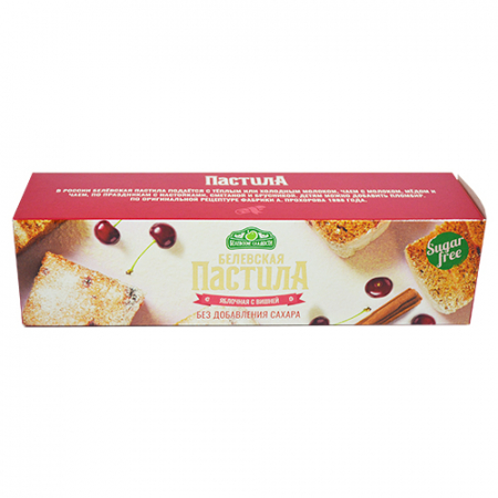 Полностью натуральный продукт без добавления сахара, безупречный вкус и необычный аромат которому достаются благодаря старинной рецептуре прошлого века. Тогда не существовало искусственных красителей, консервантов и т.п., а гастрономические качества блюд были результатом работы искусных поваров. Яблоко придает пастиле легкую кислинку, которую выгодно подчеркивает вишня. Она, в свою очередь, окрашивает десерт в розоватый цвет, а душистая корица делает вкус еще более ярким и насыщенным, но вместе с тем свежим и необычным.