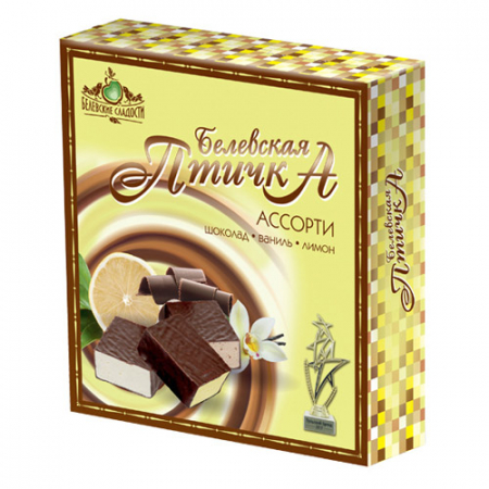 "Белевская птичка" Ассорти – это великолепное сочетание 3 традиционных вкусов в наборе сбивных конфеты ручной работы с нежнейшими ванильным ,лимонным и шоколадным ароматами , покрытые тонким слоем шоколадной глазури , приготовленные в лучших традициях , только из натурального сгущенного молока и сливочного масла по эксклюзивной рецептуре кондитерской фабрики «Белевские сладости». К онфеты «Белевская птичка» из натуральных ингредиентов с разными вкусами – неповторимый сладкий десерт из детства , которому всегда рады , он украсит любое Ваше торжество и сладкий стол.