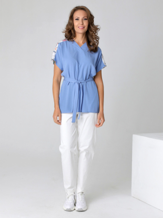Блуза прямого силуэта с разрезами по бокам и цельнокроенными короткими рукавами подходит девушкам и женщинам любого возраста. Линию талии, при желании, можно подчеркнуть поясом. Эта лаконичная модель летнего блузона из "жатой" вискозы с модным ярким принтом позволит Вам превосходно выглядеть, как на прогулке, на отдыхе, так и в офисе.
