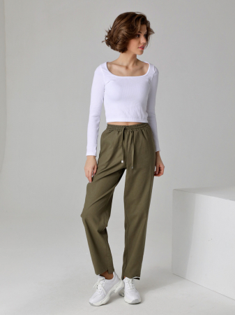 Укороченные прямые брюки на поясе с эластичной тесьмой. На передних половинках обработаны косые карманы. Эти летние брюки выполнены из смесовой ткани со льном, которая имеет характерные неровности и утолщения, что подчеркивает ее натуральность. Сочетайте широкие брюки с топами, футболками, жакетами, меняйте обувь и аксессуары и они станут любимой вещью Вашего гардероба.