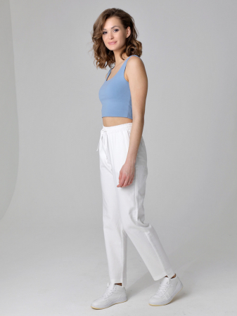 Летние прямые брюки на поясе с эластичной тесьмой. На передних половинках обработаны косые карманы. Эти летние брюки выполнены из смесовой ткани со льном, которая имеет характерные неровности и утолщения, что подчеркивает ее натуральность. Сочетайте широкие брюки с топами, футболками, жакетами, меняйте обувь и аксессуары и они станут любимой вещью Вашего гардероба.