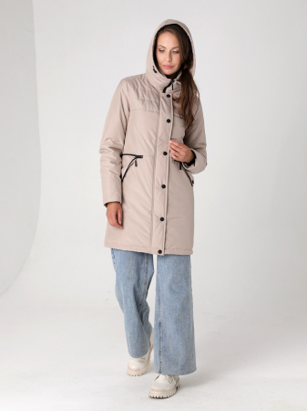 Стильная куртка-парка прямого силуэта с застежкой на двухзамковую молнию (которая позволяет расстегнуть куртку как сверху, так и снизу, регулируя тем самым удобство посадки) с ветрозащитной планкой на кнопках. Воротник - уютная стойка, переходящая в регулируемый капюшон. Низ втачного рукава оформлен трикотажной манжетой. Прорезные карманы с молнией можно эффектно расстегнуть, зафиксировав кнопкой. Есть внутренний кармашек на молнии. Прямой силуэт парки можно скорректировать затяжкой по спинке. Такая демисезонная куртка подойдет девушкам и женщинам любого возраста. Плащевая ткань имеет водоотталкивающую пропитку, которая выдержит небольшой осенний дождь или снег. Хорошо зарекомендовавший себя холлофайбер, плотностью 150 г/м, защитит от холода и ветра. Подкладка в изделии выполнена из ткани черного цвета в тон с контрастной фурнитурой.