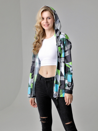 Летняя бесподкладочная ветровка с капюшоном имеет прямой силуэт и рукава покроя реглан. Такая лаконичная легкая курточка с накладными карманами выручит Вас в дождливый летний день. Ветровка хорошо садится на любую фигуру и подходит девушкам и женщинам разных возрастных групп. При необходимости куртку можно компактно свернуть и она поместится даже в маленькую сумочку, а если ветровка помнется, то модный актуальный рисунок на ткани скроет это от посторонних глаз.