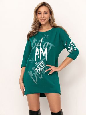 Туника женская длиной до колена, объемная по груди и зауженная к низу- форма " баллон". Плечо спущенноу, рукав 3/4. В боковых швах внутренние карманы. Горловина округлой формы с обтачкой. По переду и рукаву выполнен дизайнерский принт.