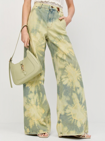 Это широкие джинсы с высокой посадкой идеально подходят для создания расслабленного, непринужденного образа. Также подходят как для повседневного ношения, так и для особых, но неформальных случаев. Изготовленные из мягкого традиционного денима, они обеспечивают полное сочетание удобства и практичности. Высокая талия с вытачками сзади для улучшения посадки пояса, карманы "хулиганы", свободные штанины сильно расширяющиеся к низу, позволяют получить утонченный силуэт и подчеркнуть особенности женской фигуры наилучшим образом и в тоже время обеспечить свободу движений. Эти джинсы с уникальным эффектом стирки по технологии "Тай-дай (Tie-dye)", т.е.способом стирки путем скручивания, складывания и заматывания изделия с целью получения уникальных хаотичных и размытых узоров и последующим эффектом подкрашивания "GET DIRTY", т.е. эффектом запачканных джинсов.