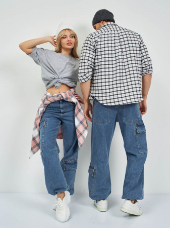 Самые ультрамодные и популярные карго джинсы на сегодня из нашей коллекции для всех . Посадка Baggy fit в этой модели это мешковатые джинсы с высокой талией, широкими штанинами по всей длине. Для получения дополнительного объема спереди под коленом сделаны две вытачки. Рекомендуется носить слегка приспущенными на бедра. По низу штанин вставлен шнур, с помощью которого при затяжке низа можно получить стиль джинсов "парашютов". Линия бокового шва прямая и шов сделан в разутюжку . Застежка на молнии. Выполнены из традиционной хлопковой ткани denim. Классическая средняя стирка "stone wash". Джинсы дополнительно чуть-чуть подкрашены в желтый цвет для получения эффекта "GET DIRTY", т.е. эффекта запачканных джинсов.
