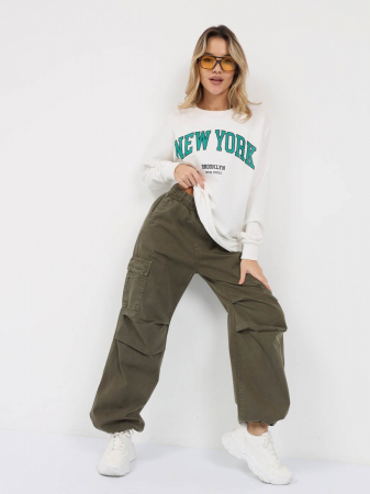 Женские модные брюки карго-парашюты. Посадка Loose fit (широкие по бедру), прямые, широкие штанины по всей длине. Для получения дополнительного объема спереди в области колена сделаны две складки. Высокая посадка по талии, пояс на эластичной резинке со шнуром. Без застежки по гульфику. Брюки имеют боковые косые карманы, по бокам накладные карманы с клапаном. По низу штанин вставлена круглая шляпная резинка, которую с помощью фиксатора можно затянуть и получить стиль брюк "парашюты". Выполнены из мягкой ткани gabardine. Крашение Garment dayed , т.е. брюки покрашены в готовом виде после пошива. Параметры указаны для размера S. Длина шагового шва - 81,0 см.