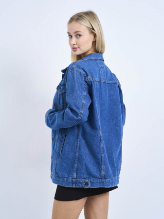 Классическая женская джинсовая куртка свободного покроя. Прямой силуэт, пройма и рукава обеспечивают комфорт и не сковывают движения; по низу рукавов манжеты, застегивающиеся на пуговицу; небольшой воротник; на груди карманы с клапаном, также застегивающимся на пуговицу; функциональные боковые прорезные карманы "в листочку"; на поясе по бокам куртки хлястик и пуговица. Выполнена из неэластичной традиционной плотной ткани denim. Классическая средняя стирка с потертостями по швам.