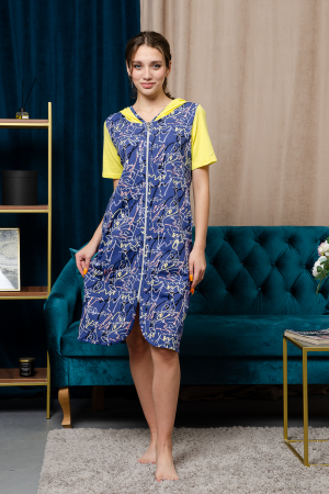 Халат на молнии полуприлегающего силуэта с короткими рукавами, капюшоном и карманами в боковых швах.