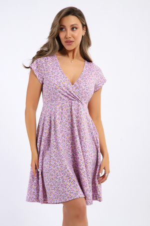 Платье с короткими рукавами, V-образным вырезом и свободной расклешенной юбкой.