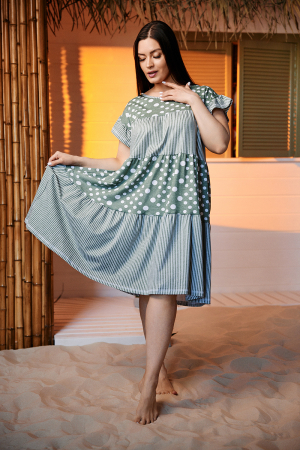 Платье женское, свободное, к низу расширенное за счет сборки каждого из трех ярусов. Рукав цельнокроеный короткий, внизу рукава рюша. Вырез горловины округлый. Эта модель платья очень комфортна для любого типа женской фигуры, а сочетание ткани в горошек и полоску придает изделию особую привлекательность.