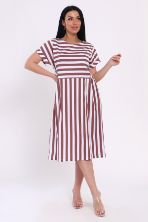 Платье женское из кулирки с принтом в виде ярких широких полос. Модель свободного кроя, с завышенной отрезной талией со складками. Круглая горловина, спущенная пройма обработана широким манжетом, на передней полочке рельефы. Разное направление полос делает платье стильным и привлекательным. Лёгкое, воздушное, приятное к телу платье, необходимая вещь в женском летнем гардеробе.