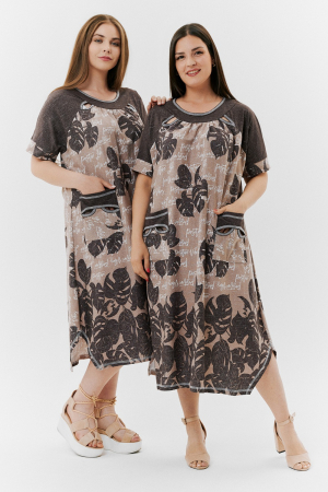 Платье женское, расширенное к низу. Рукав реглан, короткий, на манжете. По горловине - обтачки, в шве притачивания рукава к полочке в области обтачки, разрез в форме листка. На полочке накладные карманы, с обтачкой и разрезами. Боковые швы внизу платья срезаны под углом.