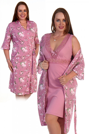 Пеньюар женский из кулирки, халат + сорочка. Запашной халат с рукавами до локтей, дизайн в виде цветов, длина чуть ниже коленей. Сорочка без рукавов, кружевная отделка и вставки, длина чуть выше коленей. Две расцветки розовая и кофейная. Размеры от 46 до 60.