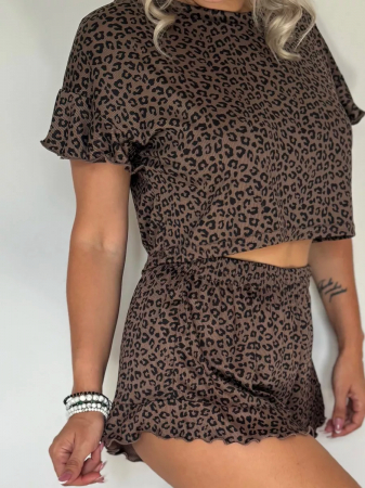 Пижама с шортами и топом в рубчик идеально подойдет для сна, повседневной носки, а также для занятия йогой и фитнесом. Пижама выполнена из легкого и приятного материала на основе вискозы. Ткань - лапша в рубчик очень приятная к телу. Укороченная футболка с рюшами over size универсальна и практичка. Шорты имеют удобную резинку и создают идеальную посадку. Леопардовый принт самый трендовый в этом сезоне, поэтому вы точно будете самыми стильными.