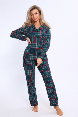 Пижама состоит из кофты и брюк. Брюки с карманами. Рубашка на пуговицах с воротником и длинными рукавами на манжетах.