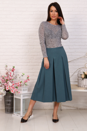 Брюки-кюлоты со встречными складками. Благодаря ширине и крою штанин напоминают юбку. Застежка-молния