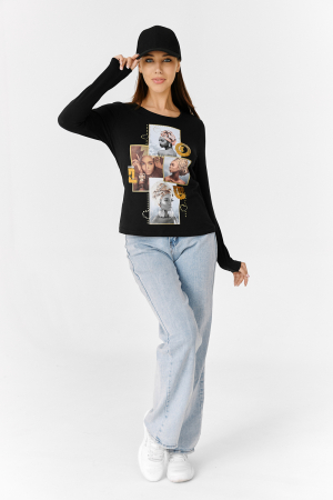 Туника полуприлегающего силуэта, с округлой горловиной, длиной до середины бедра. Рукав втачной, длинный. Горловина обработана бейкой из основного полотна. На полочке красивая печать, декорированная золотыми пайетками