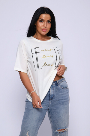 Футболка с благородным блеском золота на необыкновенно женственном принте HE US притягивает взгляд и позволяет чувствовать себя необыкновенной! Прямой силуэт, выверенная длина рукава до локтя, обработка деталей вкруговую с закрепкой. Горловина выполнена из основной ткани. Большие размеры!
