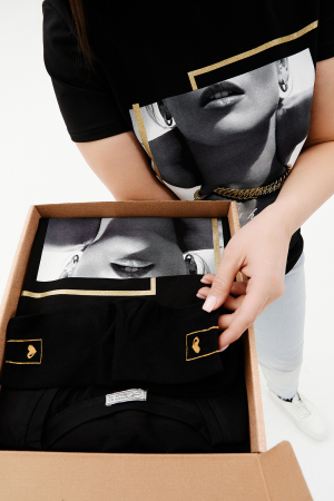 Подарочный набор НЕЗНАКОМКА. Черная женская футболка с принтом и носки с принтом подчеркнут вкус и чувство стиля. Подарочный набор упакован в крафтовую коробку с тематическим принтом. Футболка из хлопка и лайкры подойдет для повседневной носки и для выхода из дома. Футболку будет удобно носить навыпуск или заправлять, отлично сочетается с юбкой, брюками с джинсами, а также можно надеть под пиджак, жакет или кардиган. Футболка будет отлично сидеть практически на любой фигуре. Носки подойдут к любой одежде и обуви. Изготовлены из высококачественного хлопка, который отлично впитывает влагу, пропускает воздух и подходит даже для самой чувствительной кожи. Хорошо сохраняют форму и цвет, устойчивы к истиранию. Подарочный набор НЕЗНАКОМКА будет отличным подарком второй половинке, близкой подруге, маме или сестре. Рост модели на фото 165 см, размер 48. Размер носков 23-25.