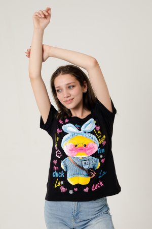 Футболка прямого силуэта, с округлой горловиной, длиной до середины бедра. Рукав втачной, короткий, с отворотом. Горловина обработана обтачкой из эластичного полотна. В продаже есть аналогичная детская футболка 5126