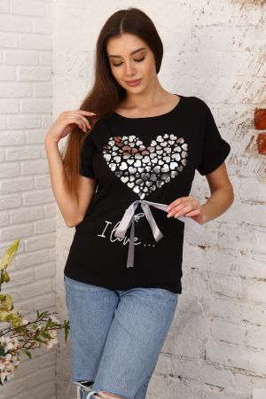 Футболка женская с современным принтом и бантом из атласной ленты, из кулирки с лайкрой высокого качества ПЕНЬЕ. Модель свободного покроя, вырез горловины в виде лодочки, короткий цельнокроеный рукав обработан манжетом с отворотом. Футболка комфортная, отлично будет сочетаться с любым элементом гардероба, создаст уникальный и неповторимый образ модницы.