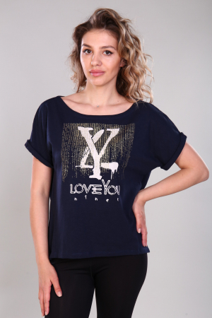 Стильная футболка из хлопка. Свободная модель со спущенным рукавом и боковыми разрезами, имеется декоративная, глянцевая печать в стиле шелкографии с добавлением глитера.