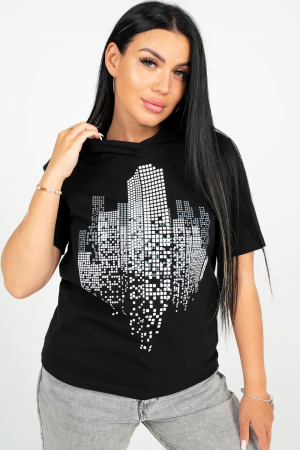 Стильная женская однотонная футболка с принтом из кулирки с лайкрой. Футболка прямого кроя, с коротким рукавом и капюшоном подойдёт под любой современный образ.
