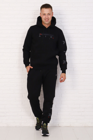 Костюм мужской с начесом из футера 3-х нитки. Костюм выполнен в 2-х цветах. Худи с капюшоном, кенгуру карман, на груди карман на молнии с принтом логотипа. Брюки на резинке со шнурком, низ на манжете.