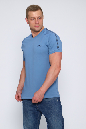 Мужская футболка представлена в пяти цветах, изготовлена из качественной кулирки с лайкрой; материал дышащий, крайне приятен к телу. Ворот футболки V-образный, обработан контрастной окантовкой, рукав-реглан на манжете. Изделие дополнено лаконичной печатью на груди, также печать нанесена вдоль по длине рукава. Футболка идеально садится на фигуру, не сковывает движения.
