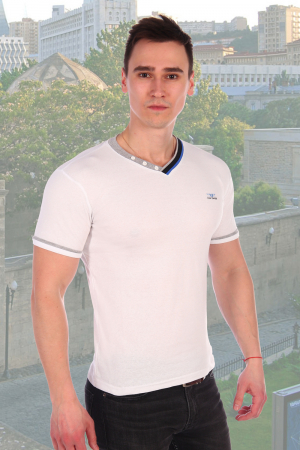 Футболка прямого силуэта с коротким рукавом. Горловина и рукава имеют обработку другой тканью. Вырез обработан пуговками. Передняя полочка имеет печать.