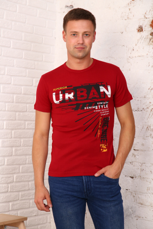 Мужская футболка из кулирки. Короткие рукава, круглая горловина, украшена печатью, прямой силуэт.