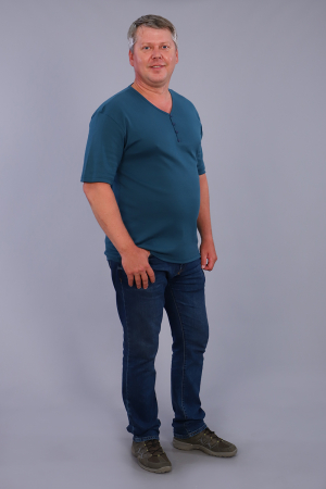 Футболка прямого силуэта. Горловина декорирована треугольным вырезом со вставкой, украшена печатью и пуговицами.