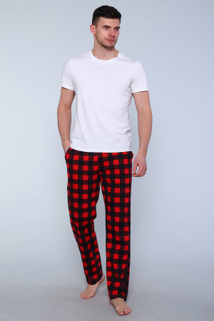 Длинные мужские брюки прямого силуэта на широкой резинке на поясе. Для удобства модель выполнена с боковыми карманами на передних половинках, вход в карман наклонный с декоративной притачной планкой. Пояс с эластичной тесьмой шириной в 4 см выполнен с декоративной отстрочкой на поясной машине. Брюки выполнены из хлопковой трикотажной ткани с принтом в виде клетки, которая дышит, в меру эластична, не стесняет движений, очень удобна и комфортна в носке дома, на улице, на природе, на пляже и на занятиях спортом.