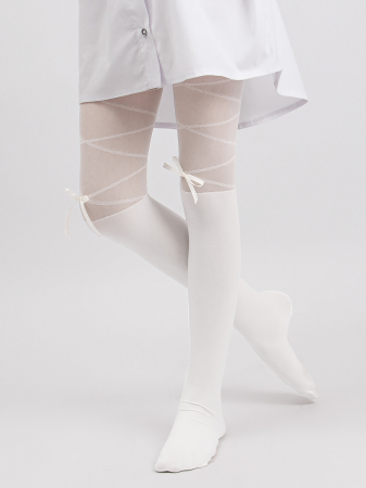 Легкие, капроновые колготки, с имитацией гольфин и рисунком полоски, декорированные атласными бантиками. Модель прекрасно подойдет как для торжественных мероприятий, так и для повседневного образа.