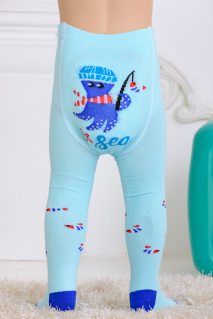 Детские колготки с рисунками. Спереди вывязаны морские звезды и надпись Hello sea (Привет, море), сзади вывязан веселый осьминог