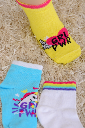 Яркие носочки для девочек. В упаковке 3 пары с разными рисунками - белый однотонный с резинкой в полоску, бирюзовый с единорогом и ярко-желтый с сердцем.