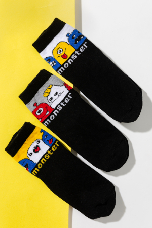 Комплект детских носочков из трех пар. На верхней части носка надпись monster и забавные рожицы монстриков.