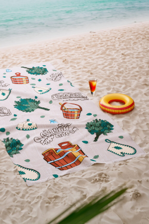 Полотенце банное Поддай жару отлично подойдет для сауны, бани и парилки. Легкое и тонкое полотенце хорошо впитывает влагу и не занимает много места в сумке. Хлопковое вафельное полотно послужившее материалом для полотенца отлично стирается и не прихотливо в уходе. Забавный банный принт с надписями ведрами и вениками гарантирует хорошее настроение. Для удобства использования к полотенцу пришита петелька.