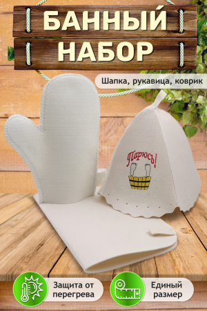 Наш оригинальный набор для бани включает в себя шапку, рукавицу и коврик. Это незаменимые аксессуары для любителей попариться в  бане и сауне. Шапка защитит волосы от сухости и ломкости, голову от перегрева и предотвратит появление головокружения. Рукавицы  – это повышение комфорта при использовании банного веника и безопасность ваших рук от появления ожогов. А индивидуальный коврик защитит от высоких температур при контакте с горячей лавкой в парилке. Оригинальная вышивка выполнена качественно и не сотрётся в процессе использования. На изделиях имеются петельки, с помощью которых их можно повесить на крючок в предбаннике. Такой набор станет отличным подарком для любителей отдыха в бане или сауне.