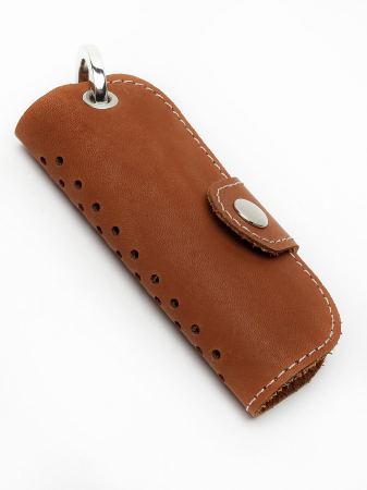 Ключница KLEO сделана из натуральной кожи, прострочена по периметру, что не дает деформироваться краю кожи. Укомплектована кольцом-карабином а так же тремя спиральными кольцами для крепления ключей.Закрывается на кнопку.Размер 12*6 в развернутом виде 12*15