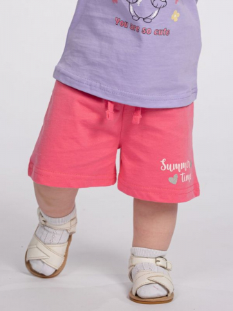 Шорты для девочки прямого силуэта из кулирки. Пояс отрезной в цвет изделия, выполнен из кашкорсе. По поясу шорт вставлен плоский утягивающий шнурок в цвет изделия, шнурок закреплен отстрочкой вдоль пояса. Низ изделия обработан швом вподгибку. На передней левой половинке шорт принт Шелкография. Надпись переводится как "Летнее время".