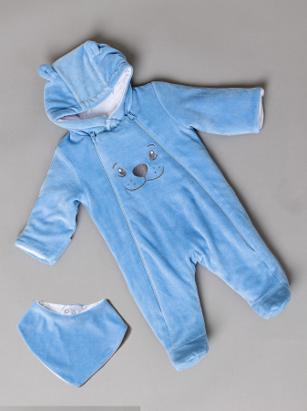 Комбинезон утеплённый для новорожденного + слюнявчик голубой из велюровой ткани. Детский комбинезон для мальчиков с вышивкой "мордочка" выполнен из хлопкового велюра премиального качества. Имеет удобный капюшон с ушками и две молнии, носочек закрытый. В комплекте слюнявчик с застежками-кнопками.