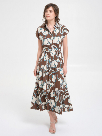 Модель с отрезной линией талии, собранной на резину. Спереди потайная застёжка на петли и пуговицы. Нижняя часть платья с защипами по талии и присборенным воланом по низу. Рукав цельнокроеный короткий. Талия подчёркнута съёмным завязывающимся поясом из основной ткани.