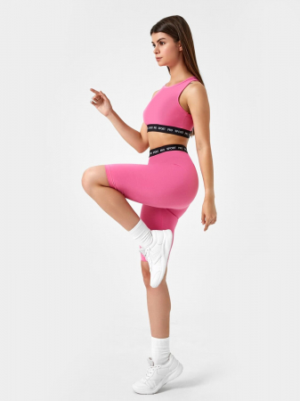 Удобный спортивный комплект из легкой трикотажной кулирки. Включает топ и шорты-велосипедки. Топ облегающего силуэта, с круглым вырезом горловины и «американской» проймой. Нижняя часть топа окантована жаккардовой эластичной тесьмой. Велосипедки облегающего силуэта, длиной до колен, с эластичной жаккардовой тесьмой в поясе. Стильно и функционально!