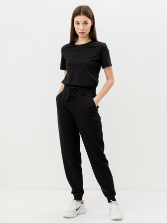 Брюки изготовлены из трикотажного полотна футер. Брюки прямые с высокой посадкой. Пояс отрезной из рибаны с эластичной тесьмой внутри. В передней части пояса с лицевой стороны пробиты петли и втянут шнур. Шов втачивания пояса распошит. Спереди обработаны карманы хулиганы. По низу брюк отрезные манжеты из рибаны.